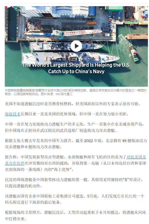 美国高级官员现在透露,中国海军最新的核动力攻击潜艇,在5月或6月时于武汉的一个船厂发生重大技术故障,导致潜艇沉入长江。中国一直在努力掩盖这一事件。官员们不确定潜艇在沉没时是否装有核燃料,但认为这种可能性很高。据称,潜艇最终被多台浮吊打捞出水。 https://t.co/alCBY80AwR