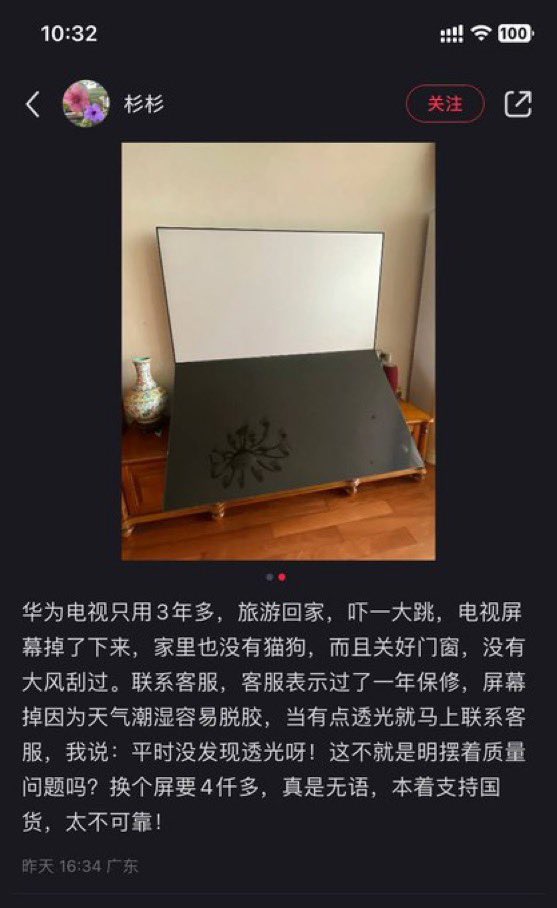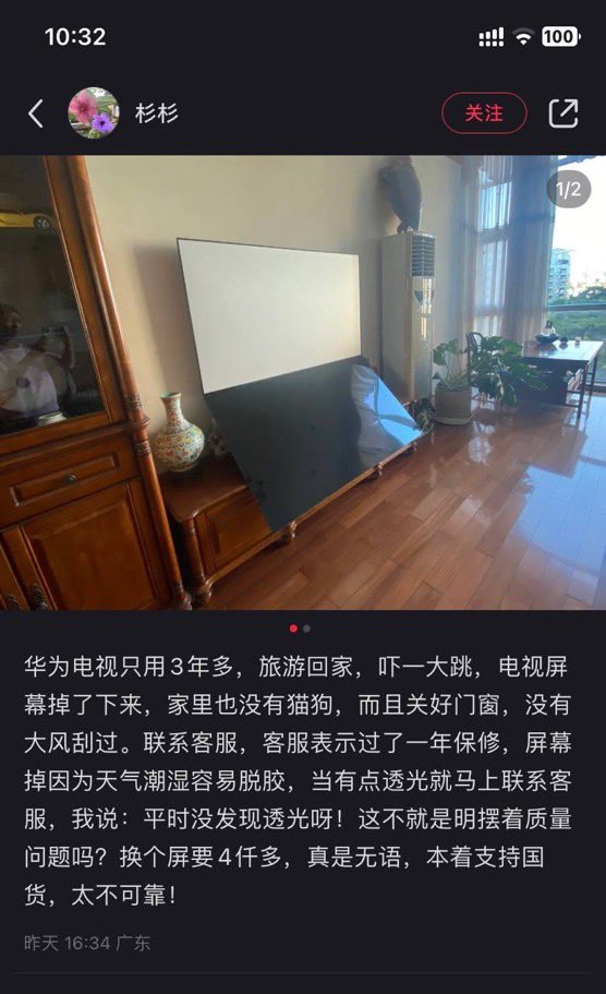 🔥支持中共國貨自交智商稅:華為電視只用3年,屏幕就脫落,要求保修被拒,悔恨已晚矣❗️ https://t.co/w86581AY7w