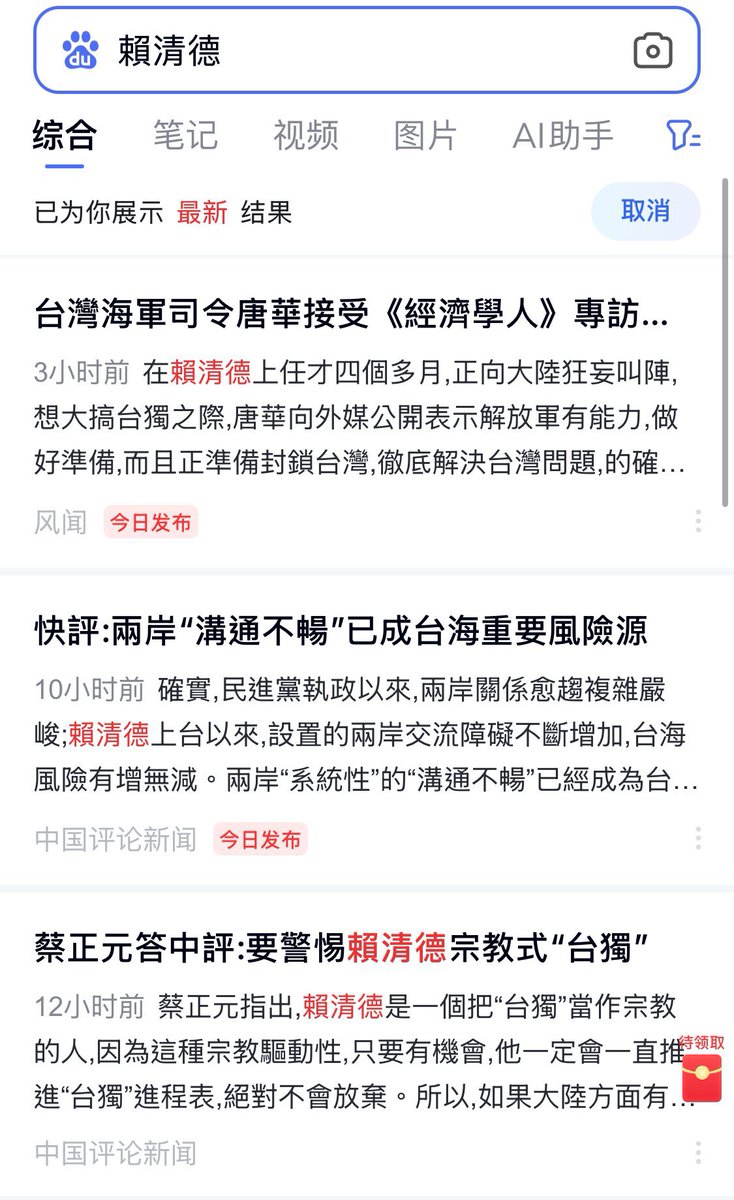 😂 轉:最愛罵賴清德的中國官媒這次又不敢報導上國際新聞的賴清德總統了,百度上任何官媒都當作沒發生,跟上次要中國去跟俄羅斯討失土一樣❗️