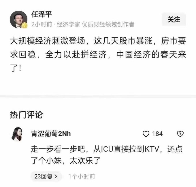 🤣 中共经济全方位萎靡,股市却异常亢奋。共匪临死之前最后一次收割韭菜的回光返照吧!正如图二热门评论:从ICU直接拉到KTV,还点了个小妹,欢乐过头了! https://t.co/9uzFisupNK
