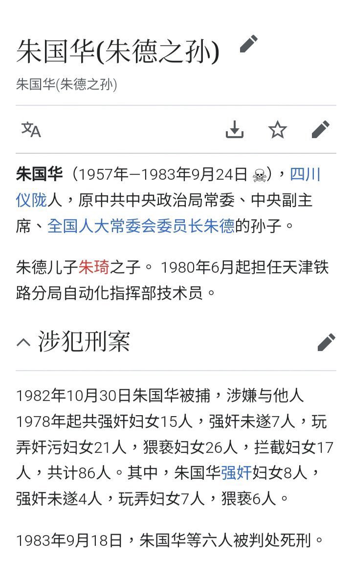 我们知道中共元老朱德的儿子叫朱琦,孙子叫朱国华,而朱国华早在1983年就因强奸罪被执行死刑 (图四),他哪来27岁的儿子?(难道是替身假死)⁉️