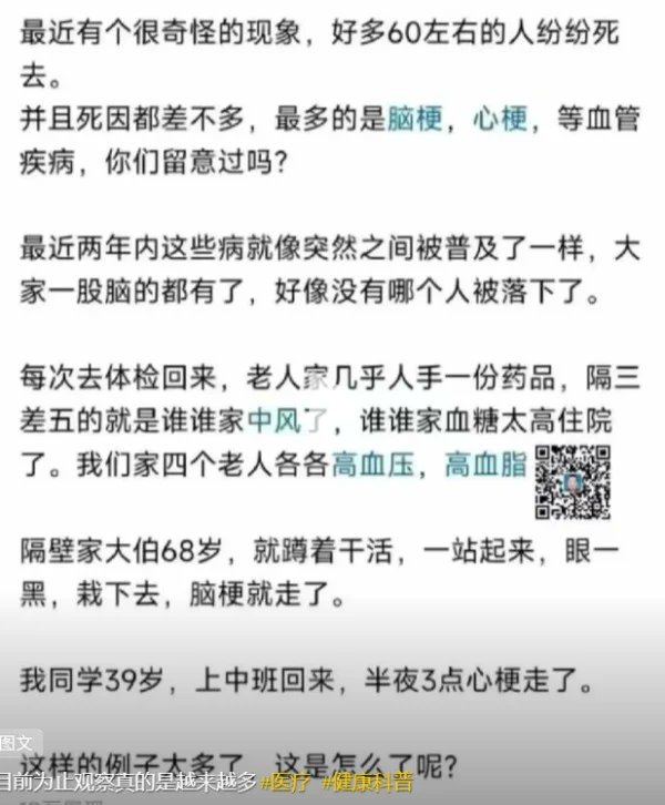 帖文称,每次体检后老人家几乎人手一份药品,隔三差五的就是谁中风了、谁血糖太高住院了。自家4位老人,每人都是高血压、高血脂。邻居大伯68岁,蹲着干活后刚起来,就脑梗走了。一个同学仅39岁,中班回家半夜3点心梗走了。“这样的例子太多了,这是怎么了呢?”