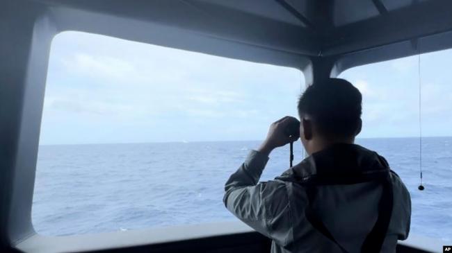 在印尼海事安全局(BAKAMLA)发布的这张没有注明日期的照片中,一名印尼,海事安全局人员在南中国海有争议的北纳土纳海域使用望远镜监视一艘中国海警船的动向。(2024年10月24日)