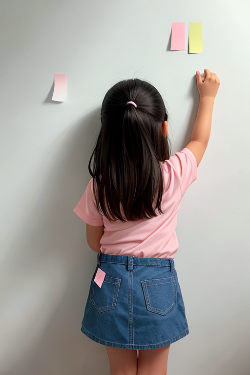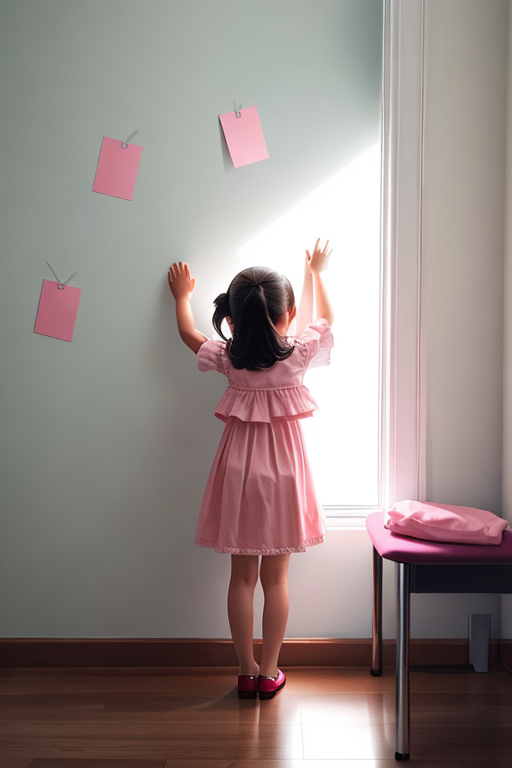 nostr:npub102ca8pnhy26vh2akepgr4vleyew65nuzug5val3sycslfe0wruwqzezyfp imagine “rear view shot of a little girl sticking notes to the wall standing on a chair”