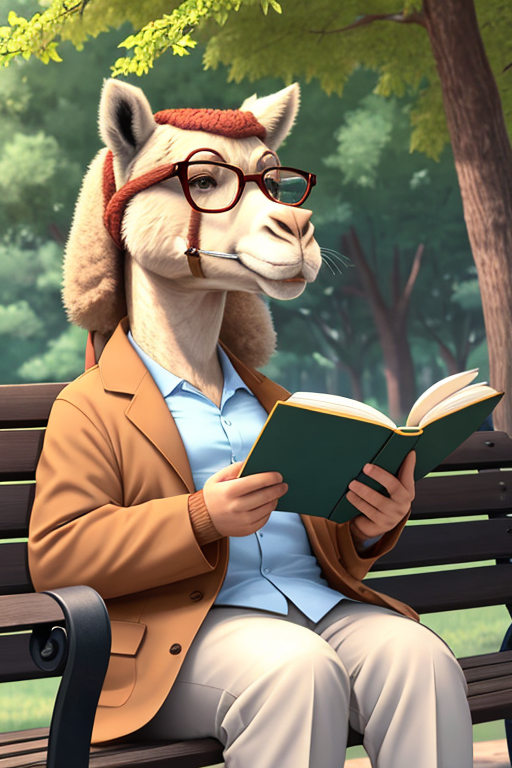 nostr:npub102ca8pnhy26vh2akepgr4vleyew65nuzug5val3sycslfe0wruwqzezyfp imagine a cartoon camel with thick rim glasses reading a book and sipping coffee on a park bench