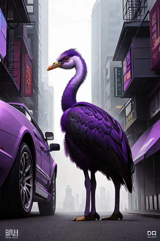 nostr:npub102ca8pnhy26vh2akepgr4vleyew65nuzug5val3sycslfe0wruwqzezyfp imagine mj a purple ostrich looking at the camera, photorealistic, hyperrealistic, dan mumford concept art, bladerunner filter, jim lee jim wood organic painting, matte painting, bold shapes, hard edges, street art, trending on artstation, by huang guangjian and gil elvgren and sachin teng