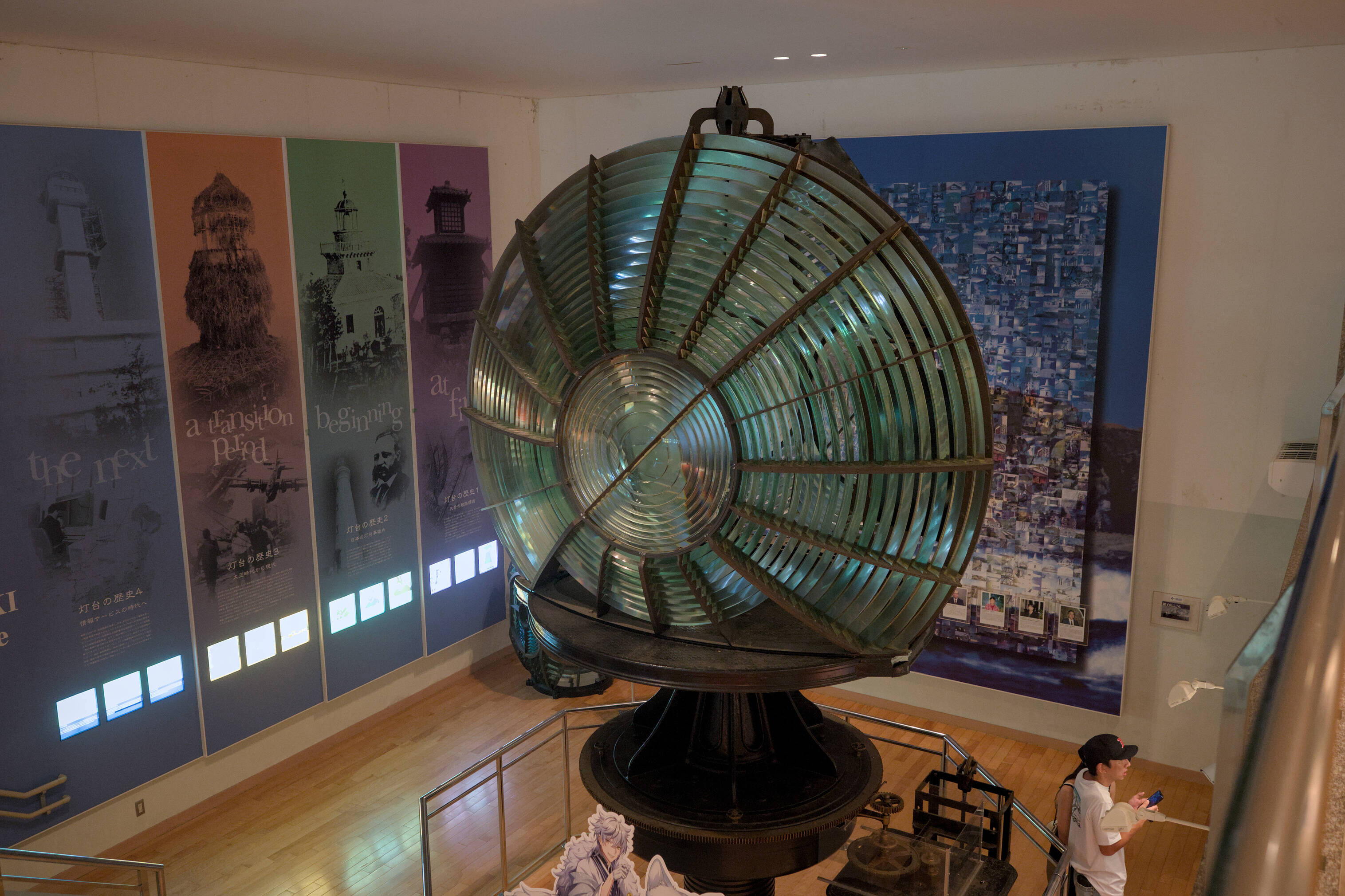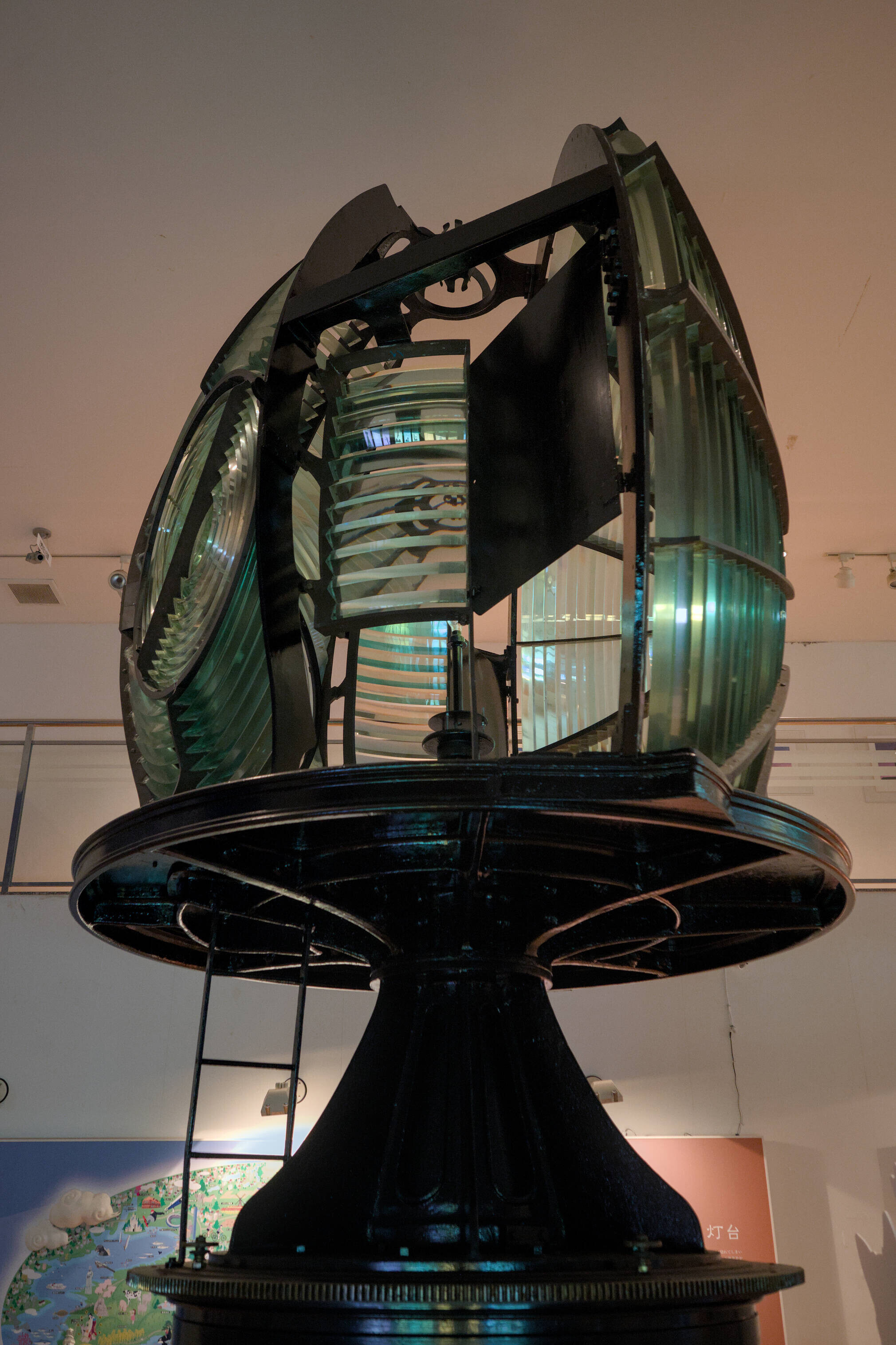 灯台の光を集光するレンズ。光源は基本的に全方位に光を出すので、遠くに飛ばすには集光して一本のビームにする必要があるんですね。あと横から見ると灯台毎にパターンを変えるために複雑な構造になってますね
