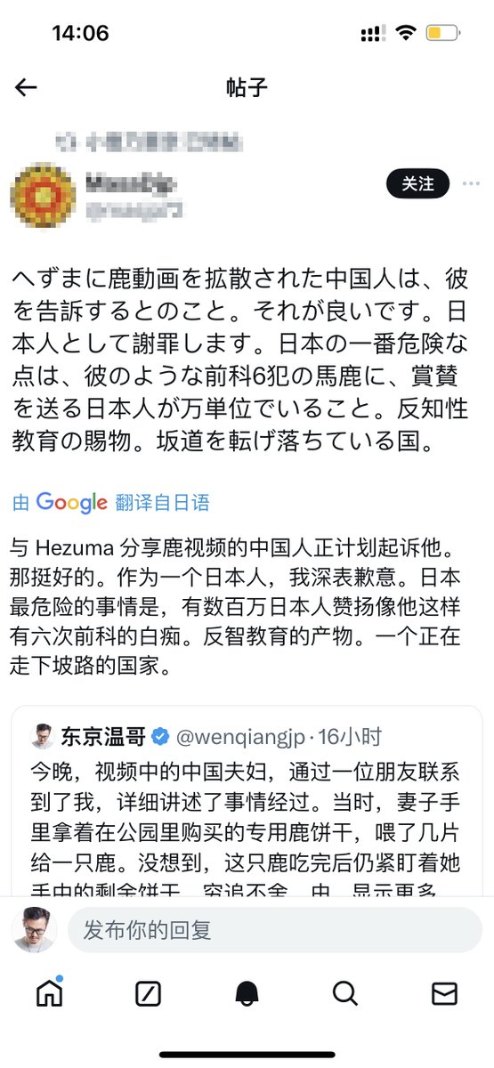 另外,这对中国夫妇是在日本生活、创业多年的“永住者”。他们对此事感到极度失望,并表示将会告知身边的中国朋友,今后永远不要再去奈良。