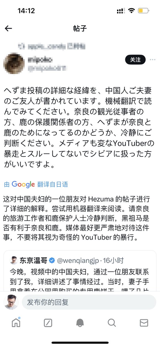 今晚,视频中的中国夫妇,通过一位朋友联系到了我,详细讲述了事情经过。当时,妻子手里拿着在公园里购买的专用鹿饼干,喂了几片给一只鹿。没想到,这只鹿吃完后仍紧盯着她手中的剩余饼干,穷追不舍。由于感到恐惧,她用手中的矿泉水瓶试图挡住鹿的头,仅仅是为了自我保护,而并非“打鹿”。就在此时,一位日本网红突然带着摄影机出现,对他们发出歇斯底里的咆哮和指责。