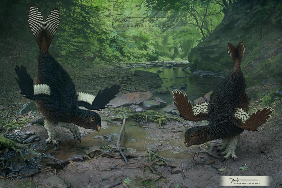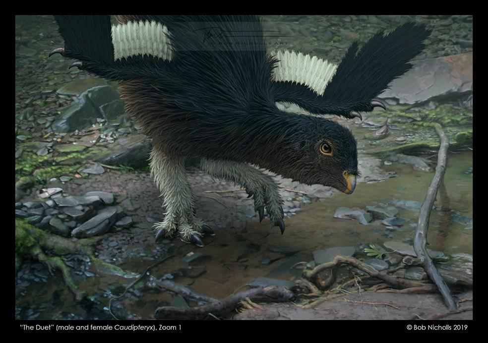 A zoom in at the male and female Caudipteryx in my painting, called "The Duet," commissioned by the University of Bristol.
