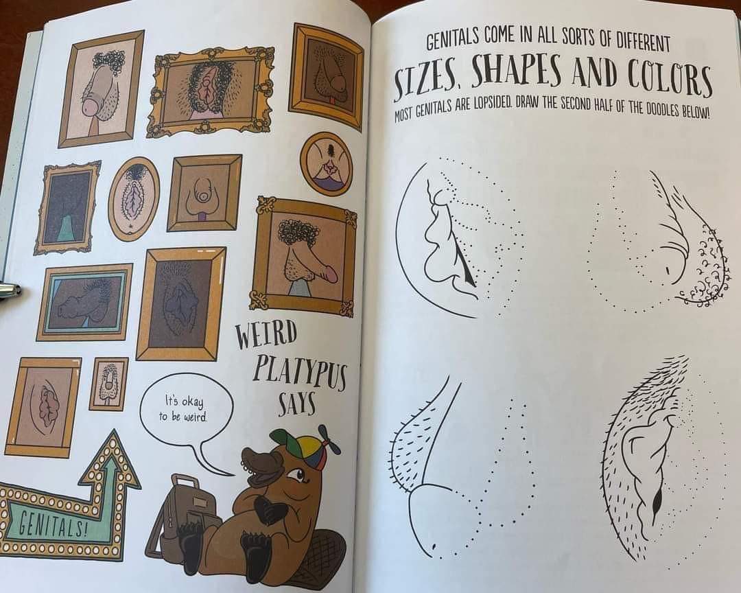 Sections of the book use cartoon pictures to depict several different male and female genitalia in various states of arousal. Children are also encouraged to use the guide provided in the book to draw “different sizes, shapes, and colors” of genitalia.
