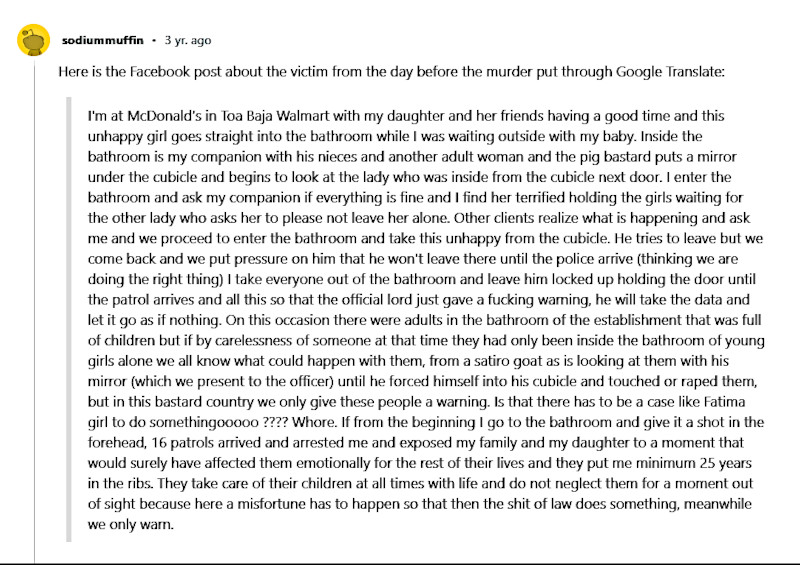"I'm at McDonald’s in Toa Baja Walmart with my daughter and her friends having a good time and this unhappy girl goes straight into the bathroom while I was waiting outside with my baby. Inside the bathroom is my companion with his nieces and another adult woman and the pig bastard puts a mirror under the cubicle and begins to look at the lady who was inside from the cubicle next door. I enter the bathroom and ask my companion if everything is fine and I find her terrified holding the girls waiting for the other lady who asks her to please not leave her alone. Other clients realize what is happening and ask me and we proceed to enter the bathroom and take this unhappy from the cubicle. He tries to leave but we come back and we put pressure on him that he won't leave there until the police arrive (thinking we are doing the right thing) I take everyone out of the bathroom and leave him locked up holding the door until the patrol arrives and all this so that the official lord just gave a fucking warning, he will take the data and let it go as if nothing. On this occasion there were adults in the bathroom of the establishment that was full of children but if by carelessness of someone at that time they had only been inside the bathroom of young girls alone we all know what could happen with them, from a satiro goat as is looking at them with his mirror (which we present to the officer) until he forced himself into his cubicle and touched or raped them, but in this bastard country we only give these people a warning. Is that there has to be a case like Fatima girl to do somethingooooo ???? Whore. If from the beginning I go to the bathroom and give it a shot in the forehead, 16 patrols arrived and arrested me and exposed my family and my daughter to a moment that would surely have affected them emotionally for the rest of their lives and they put me minimum 25 years in the ribs. They take care of their children at all times with life and do not neglect them for a moment out of sight because here a misfortune has to happen so that then the shit of law does something, meanwhile we only warn."