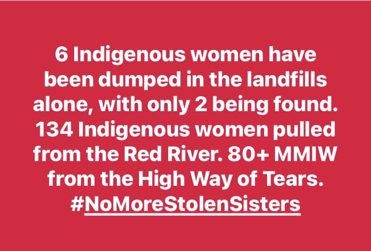 Morgan Harris, Marcades Myran, and Buffalo Woman are believed to be in Prairie Green landfill by the Winnipeg police service. Rebecca Contoìs’s remains were found in Brady landfill, and the serial killer was charged with all 4 homicides. Then Linda Beardy had been found from a Brady dumpster, and her death was ruled accidental like always in many Indigenous deaths. Tanya Nepinak had also disappeared, and her murderers admitted to dumping her in a Brady dumpster, the police had searched for her for 6 days, but she wasn’t recovered. 134 Indigenous women have been pulled from the Red River in the past decades. 80+ Indigenous women gave gone missing, or found murdered along the Highway of tears. We cannot allow Indigenous women, girls and femme two spirit people to go missing, die under suspicious circumstances, and be murdered all the time. Indigenous women/girls/2S are 12x more likely to go missing than any other group of women in Canada.