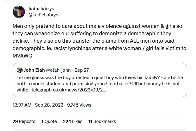 "Men only pretend to care about male violence against women & girls so they can weaponize our suffering to demonize a demographic they dislike. They also do this transfer the blame from ALL men onto said demographic. ie: racist lynchings after a white woman / girl falls victim to MVAWG"