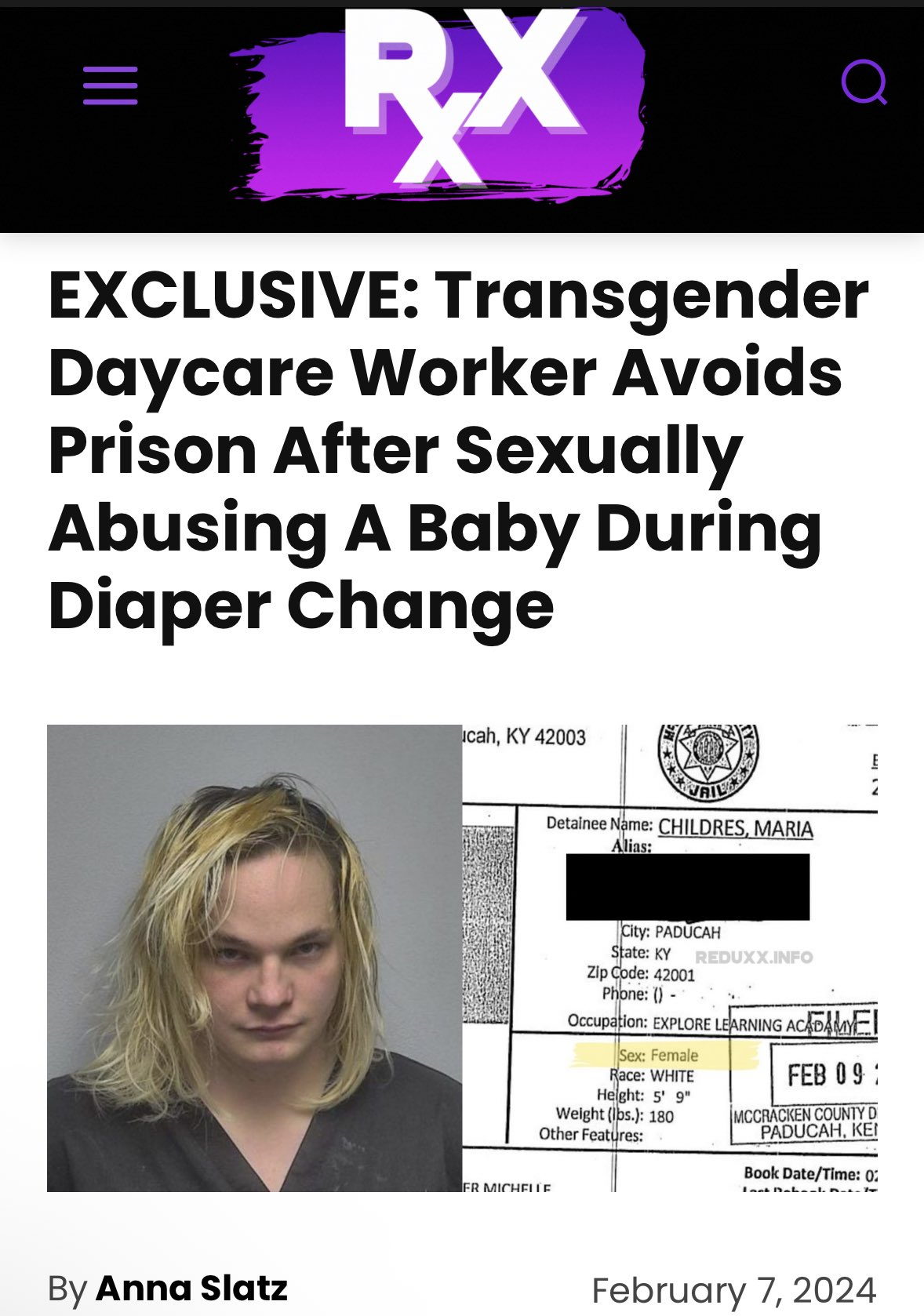 "A trans-identified male in Kentucky has reached a plea deal after being charged with sexually abusing a baby and will avoid prison so long as he meets certain conditions. Maria Childers, a former daycare worker, hired a prominent trans activist lawyer to represent him in the sickening case.