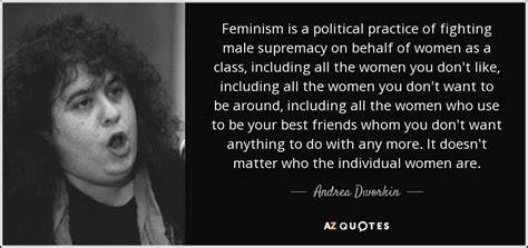“Feminism is a political practice of fighting male supremacy in behalf of women as a class, including all the women you don't like, including all the women you don't want to be around, including all the women who used to be your best friends whom you don't want anything to do with anymore. It doesn't matter who the individual women are. They all have the same vulnerability to rape, to battery, as children to incest. Poorer women have more vulnerability to prostitution, which is basically a form of sexual exploitation that is intolerable in an egalitarian society, which is the society we are fighting for.” - Andrea Dworkin