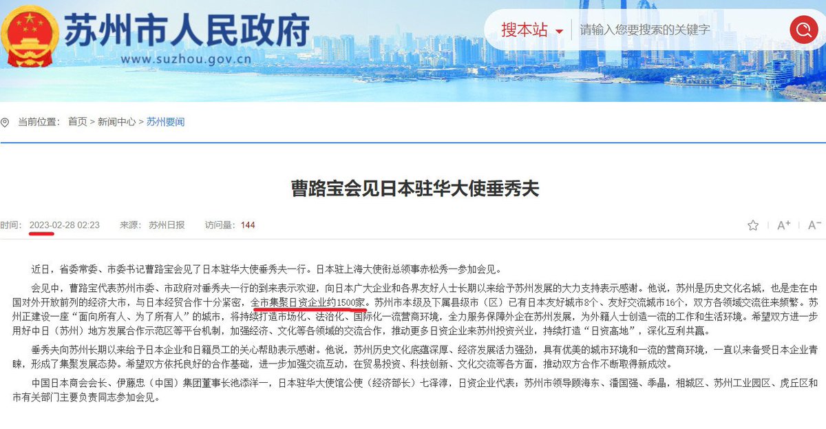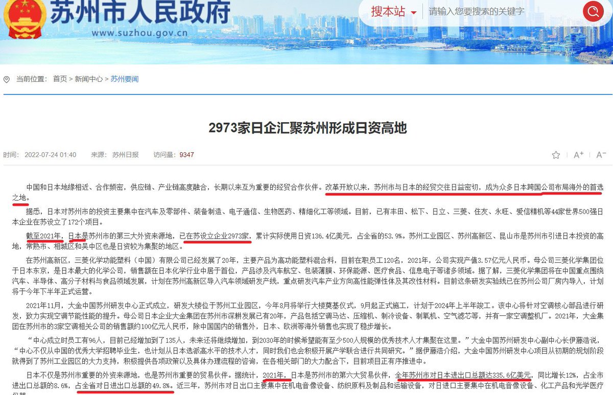 截至2021年,日本已在苏州设立企业2973家;2023年2月,苏州全市集聚日资企业约1500家。2021年,苏州市对日本进出口总额达335.6亿美元,占全省对日进出口总额的49.8%。 https://t.co/7DHIcQnFds