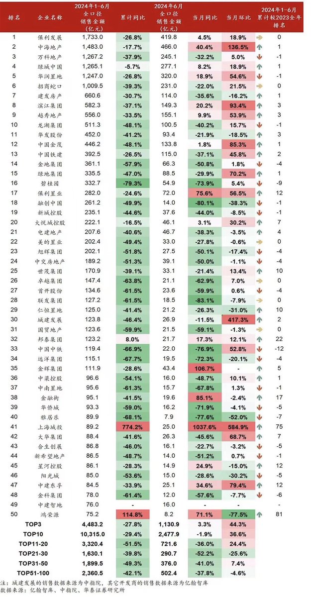 上半年百强地产商销售情况一览:部分公司6月销售同比开始实行增长。 https://t.co/On0EmXLu74