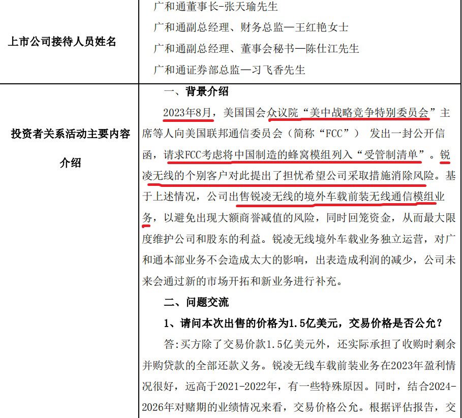 过去,英特尔是战略股东;现在,美国众议院一封公开信、个别客户希望公司消除风险——深圳上市公司广和通就被迫卖海外资产。广和通本次出售标的净资产为8.63亿元,2023年营收20.64亿元,净利润2.04亿元——出售价为1.5亿美元。