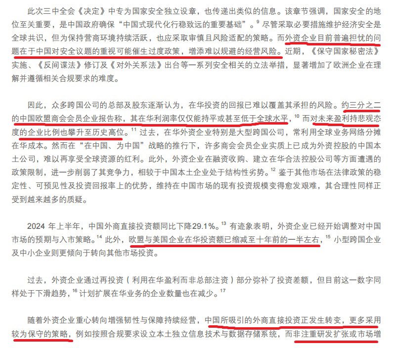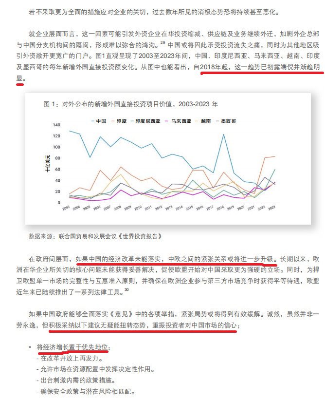 欧美中国商会今天在官网,公布了最新一期建议书:在华欧洲企业认为中国政府没有可以提振疲弱经济需求的可靠计划,而这降低了这些企业在中国投资的意愿——并详尽的提出了1043条建议。 https://t.co/mRB2n6EOEJ