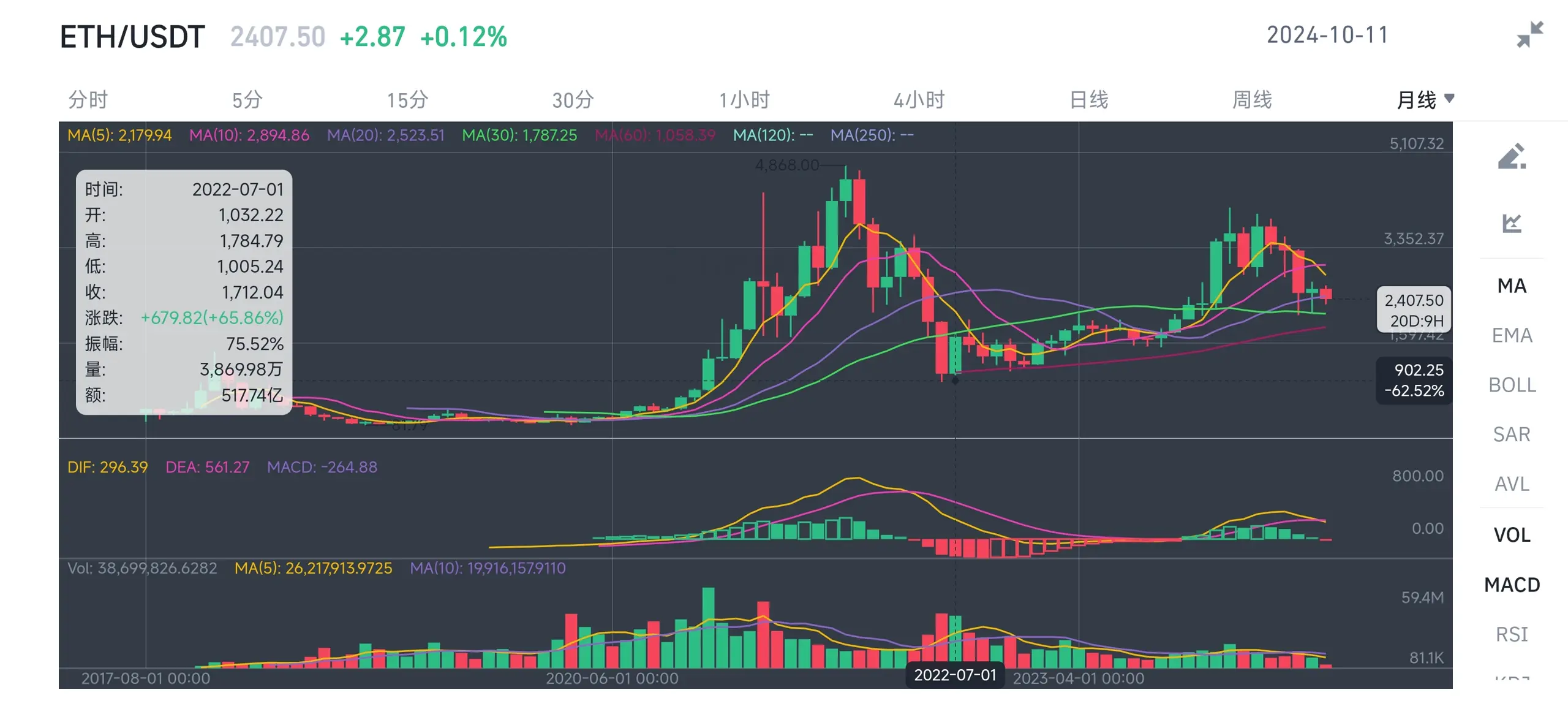 eth则是不大妙了,月线ms30拐头向下已持续1年以上且可能死叉ma60,我认为一旦跌破2100就将加速,如此,跌破900/800也并非不可能,甚至可能更低。