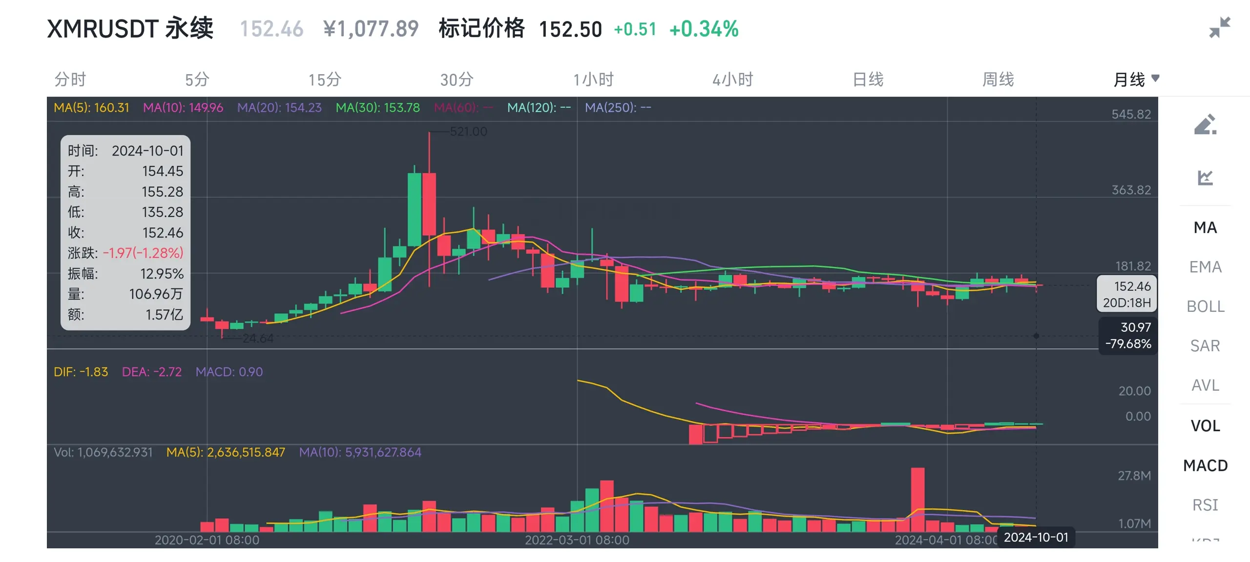 xmr的均线已经拧成了一股,k线也围绕150久矣,很明显不是筑底就是筑顶,离图穷匕见不远矣。从图形技术上看,我认为月线ma30选出的方向,以及ma5和ma10对它的金叉或死叉,基本就可以判定了。