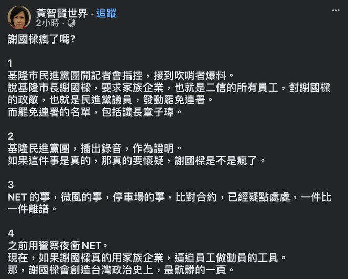 當黃智賢說謝國樑瘋了,他會創造台灣政治史上最骯髒的一頁,我還能選擇不相信嗎? https://t.co/7y0ClmTaAb