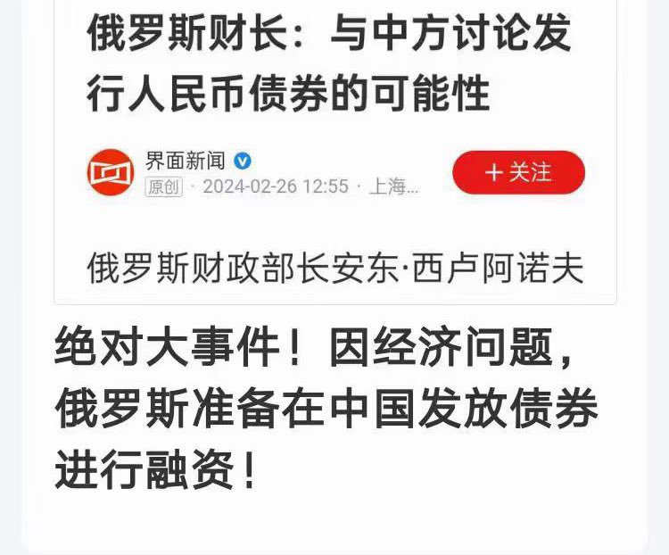 俄羅斯將在中國發行巨額的人民幣債券,以支持因爲戰爭而陷於困境的俄國經濟,説明俄羅期侵略鳥克蘭的這場戰爭,如果沒有獲得中國巨大的財政和經濟支持,是打不下去的。