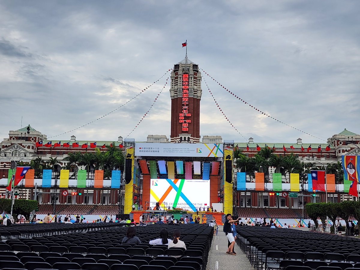 這是2024年519傍晚的台灣總統府廣場,520也就是明天,令全世界矚目的中華民國台灣第十六任總統、副總統就職典禮即將在這里隆重登場,届時台灣現任總統蔡英文將完成其八年使命,交棒給由民主選舉産生的台灣正副總統賴清德和蕭美琴,賴、蕭也將正式宣布就任台灣第十六任正副總統,台灣民主制度將進一步得到鞏固。