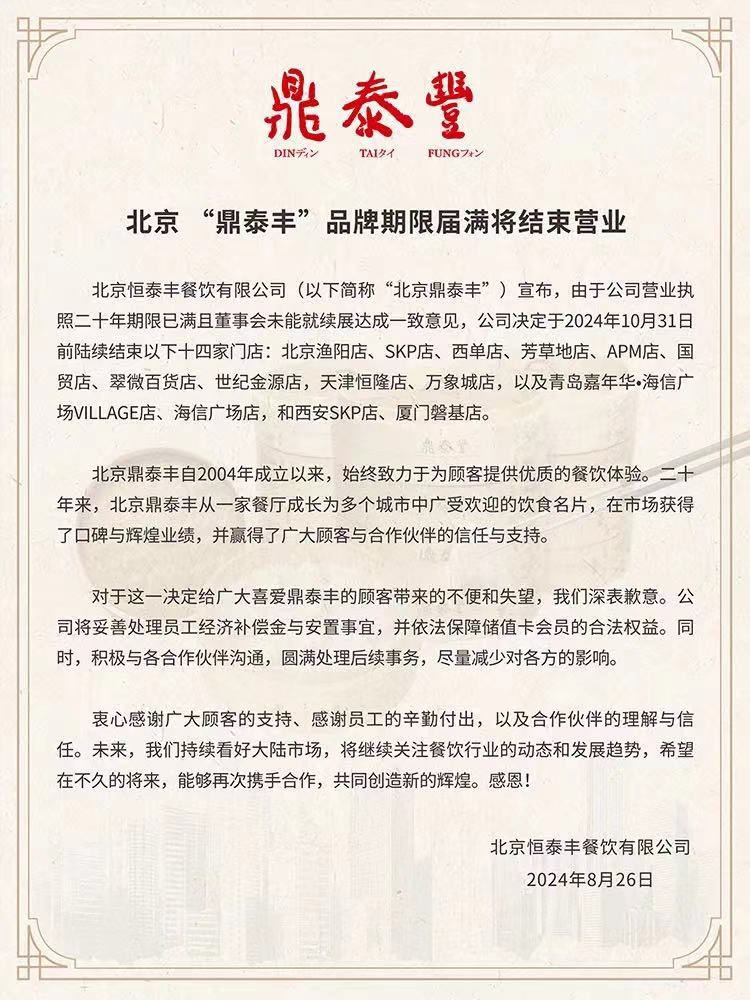 進軍中國市場近20年的台灣「鼎泰豐」今天宣布重大消息,位在北京、天津等14間門市,將於10月底陸續撤出中國華北市場。