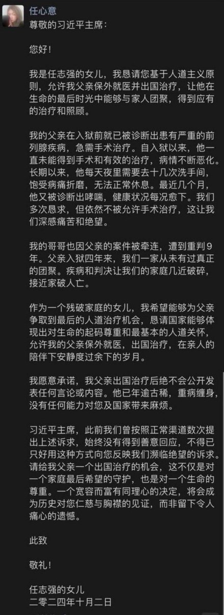 任志強女兒任心意向習近平發出公開信,懇求習近平基於人道主義原則,允許她父親保外就醫和出國治療,讓他在生命的最後時光能夠與家人團聚,得到應有的治療和照顧。 https://t.co/ybuuTJ91xc