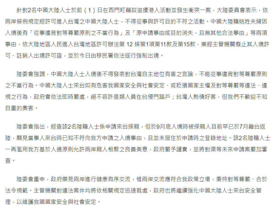 台灣陸委會強調,“中國大陸人士入境後不得發表對台灣自主地位有害的言論,不能從事違背對等尊嚴原則的不當行為。中國大陸人士來台如有危害我國家安全與社會安定或貶損國家主權及對等尊嚴等違法、違規的行為,政府會依法即時嚴處,絕不容許是類人員在台侵門踏戶;台灣人熱情好客,但我們不歡迎不知自重的奧客。”