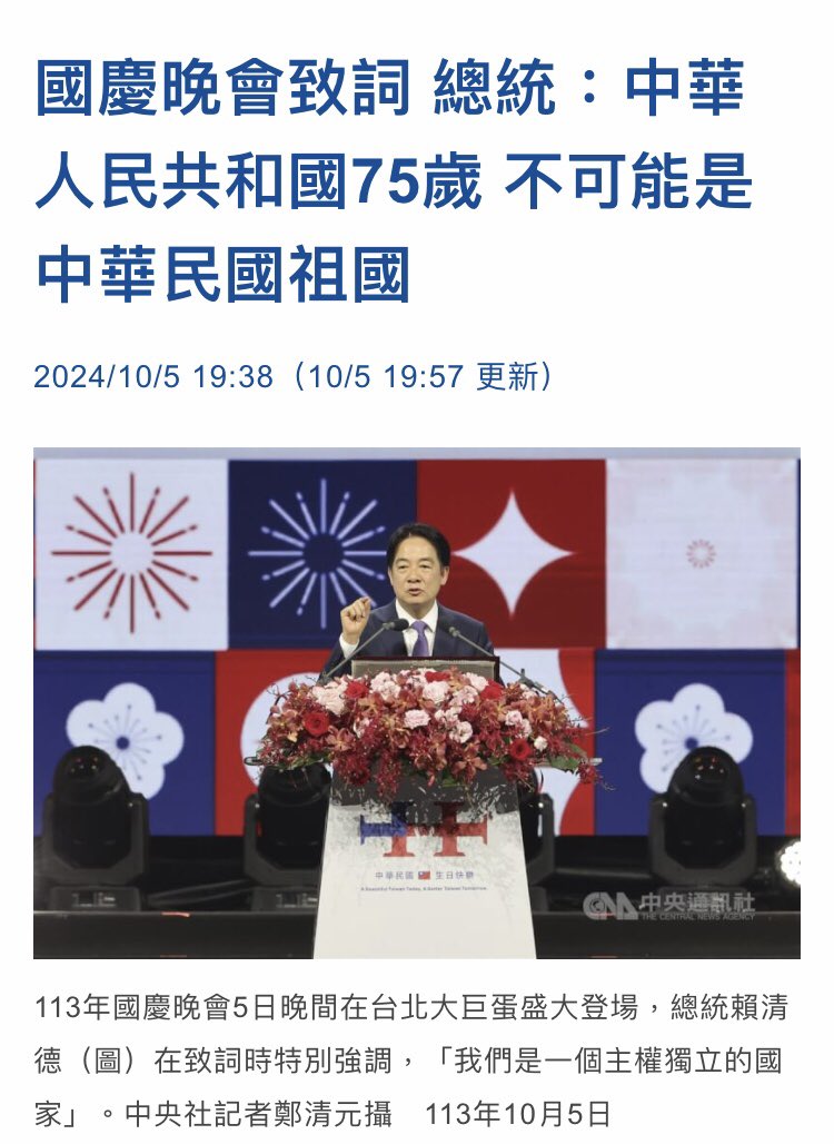 中華民國113年國慶晚會在台北大巨蛋登場。總統賴清德致詞時強調國家主權立。中華民國過113歲生日,相較中華人民共和國剛過完75歲生日,就年紀來說,中華人民共和國是絕對不可能成為中華民國人民的祖國,反倒是中華民國才可能是中華人民共和國75歲以上的民眾的祖國。