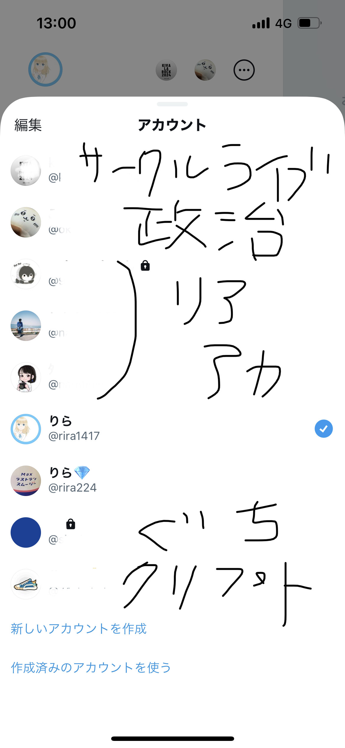 さはる・さはるサブ(昔あったAPI規制したときの避難)・さはる裏(愚痴)・さはる裏の裏(鍵愚痴)・NIP-36・NIP-36の裏・知人のNIP-36宣伝・会社公式・闘病(メンタル)・闘病(婦人科)・のるるん・のるるんサブ・バンギャ・ポエム・副業