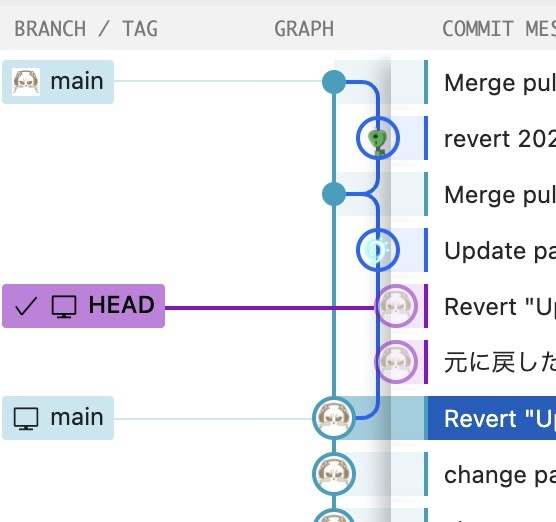 Git Lensで見た今の状態です。最悪2cec671に戻せれば…。