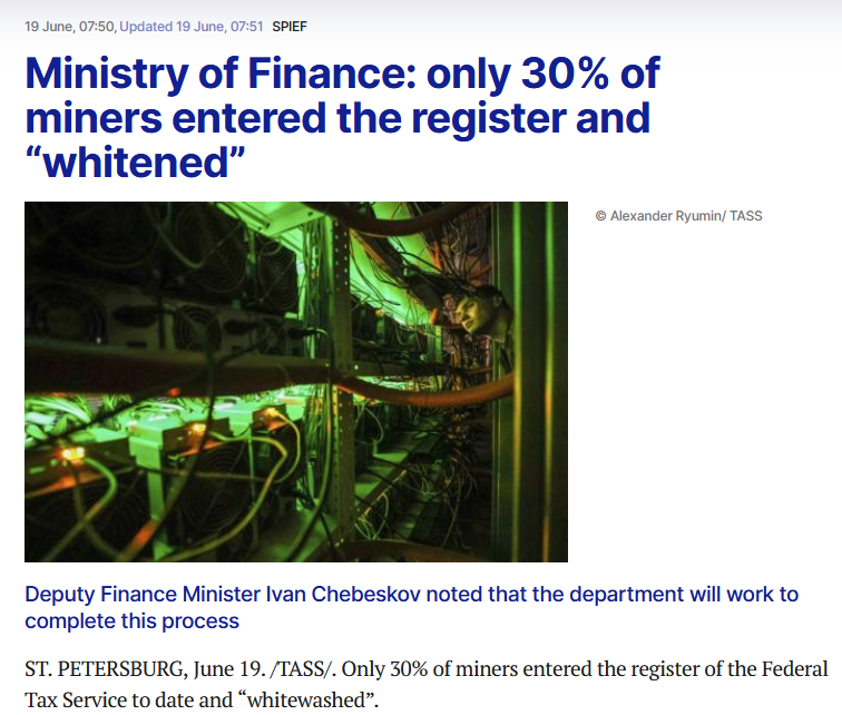Russia’s Finance Ministry says 70% of #bitcoin miners are still operating outside the official registry.