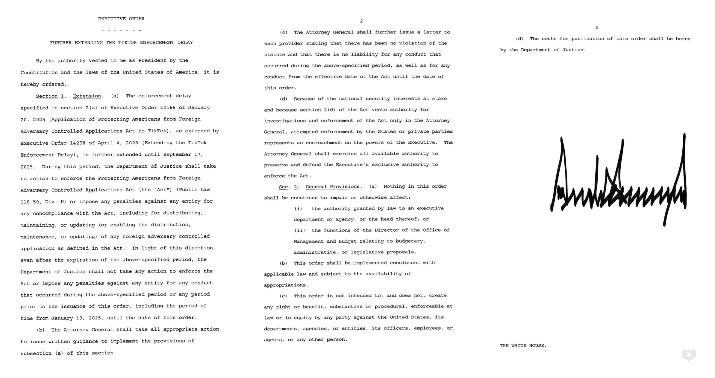 Trump signs Executive Order extending the TikTok ban by 90 days.