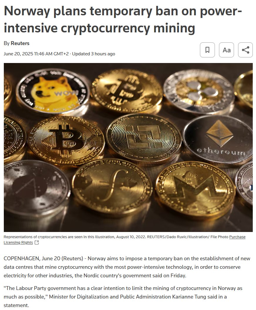 Norway moves to pause energy-intensive #Bitcoin mining.