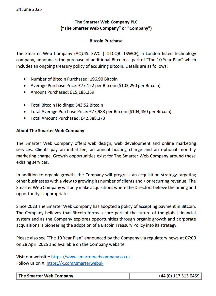 UK-listed Smarter Web Company adds 196.9 BTC to its balance sheet.