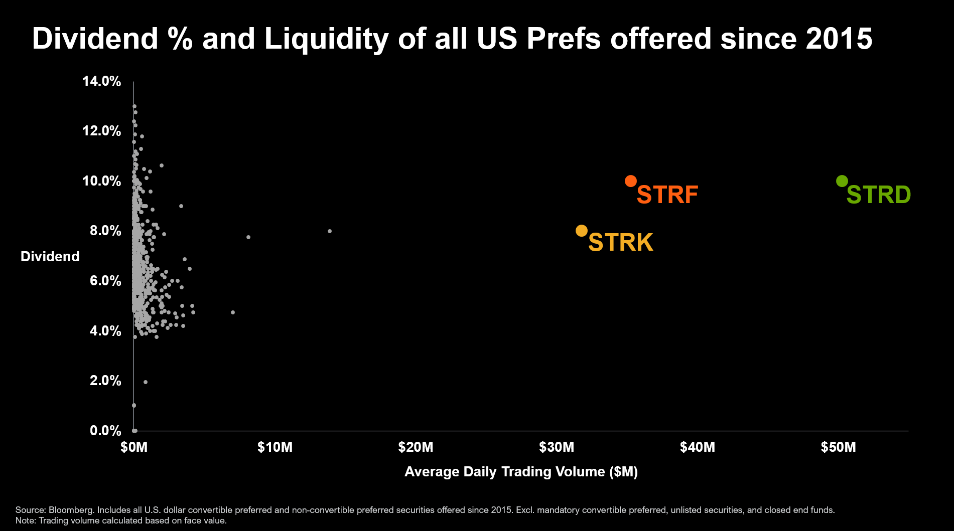 Strategy: STRD, STRF, and STRK are now the most liquid and highest-yielding preferreds issued since 2015.