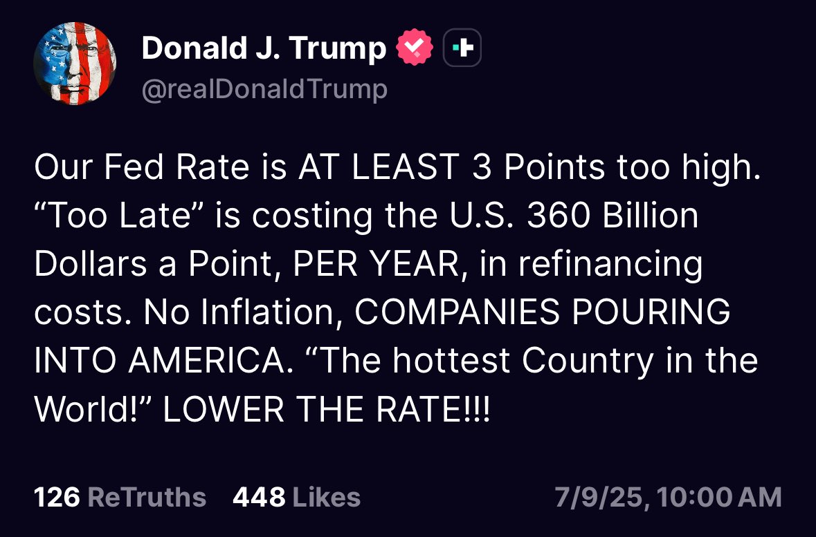 Trump calls for a massive rate cut, saying the Fed is 3 points too high.