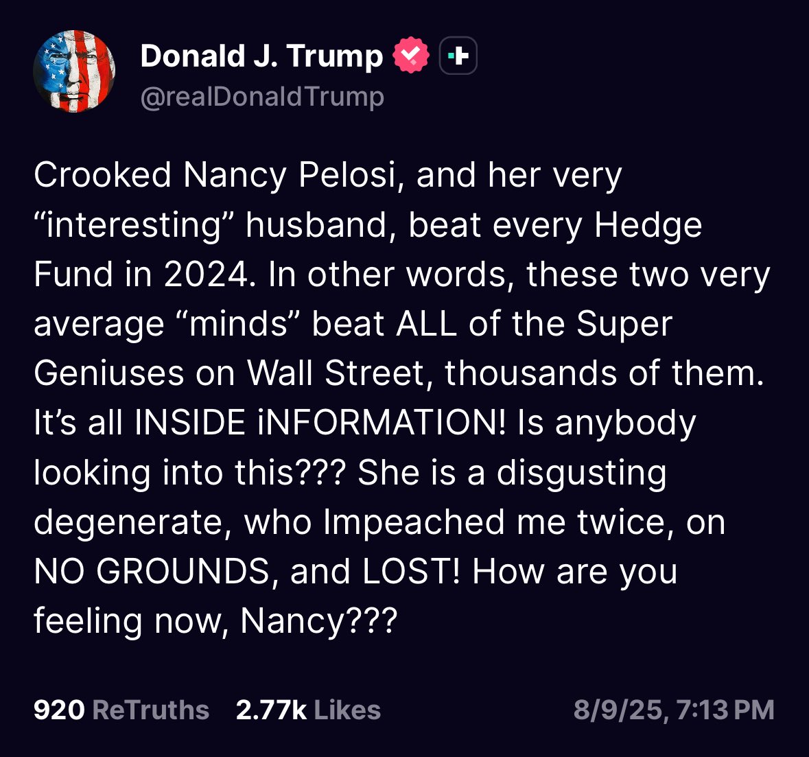 Trump claims Nancy Pelosi and her husband outperformed every hedge fund in 2024 using “inside information.”