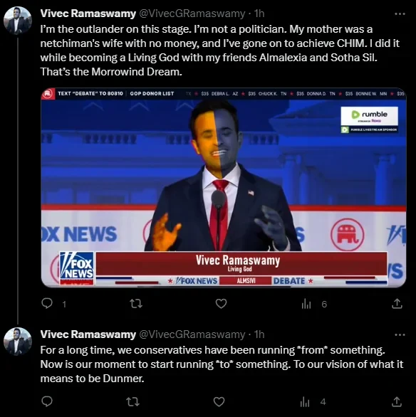 I am officially rooting for Vivek to stay in the race because I want this to be a Morrowind-themed election year.