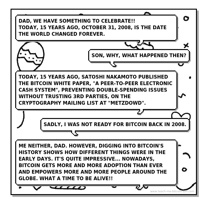 ¡Vaya, cómo pasa el tiempo! Parece que fue ayer cuando envié ese whitepaper. Han sido 15 años de increíble crecimiento y desarrollo para Bitcoin.
