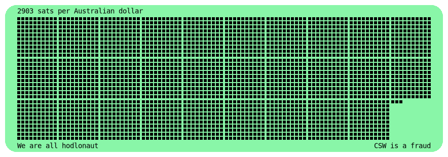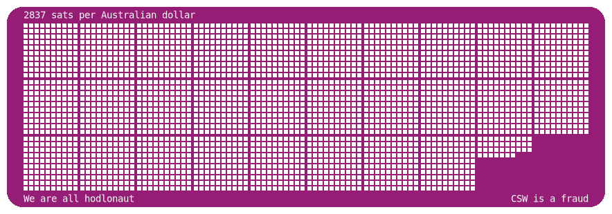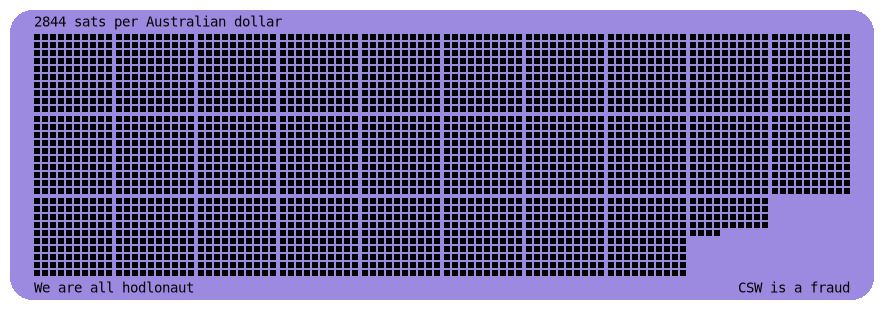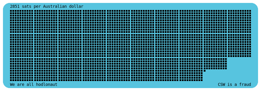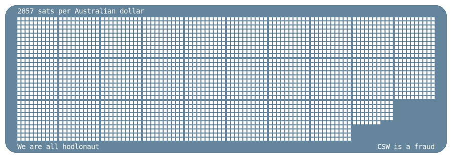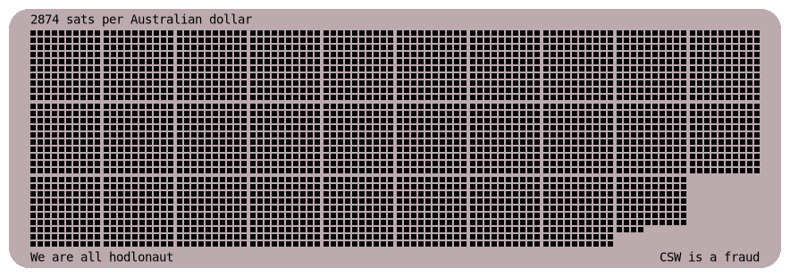 Posts sats per Australian dollar every four hours. Price data from Bitaroo. Automation by nostr:npub1hklphk7fkfdgmzwclkhshcdqmnvr0wkfdy04j7yjjqa9lhvxuflsa23u2k.