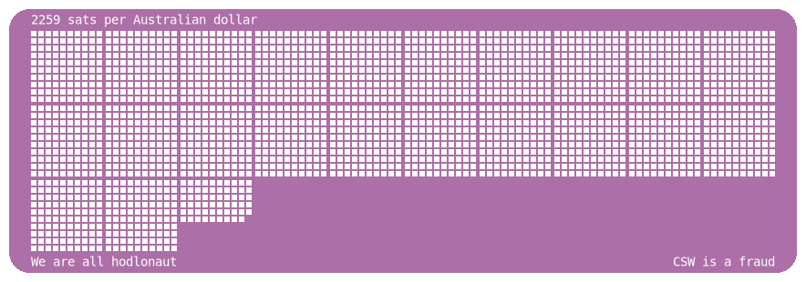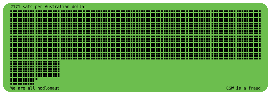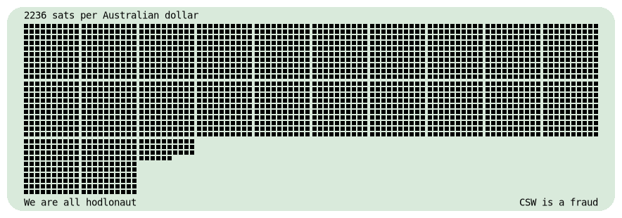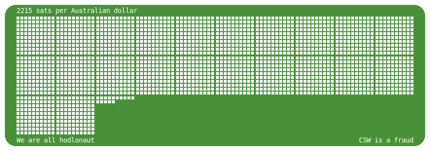 Posts sats per Australian dollar every four hours. Price data from Bitaroo. Automation by nostr:npub1hklphk7fkfdgmzwclkhshcdqmnvr0wkfdy04j7yjjqa9lhvxuflsa23u2k.