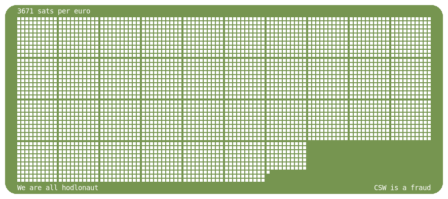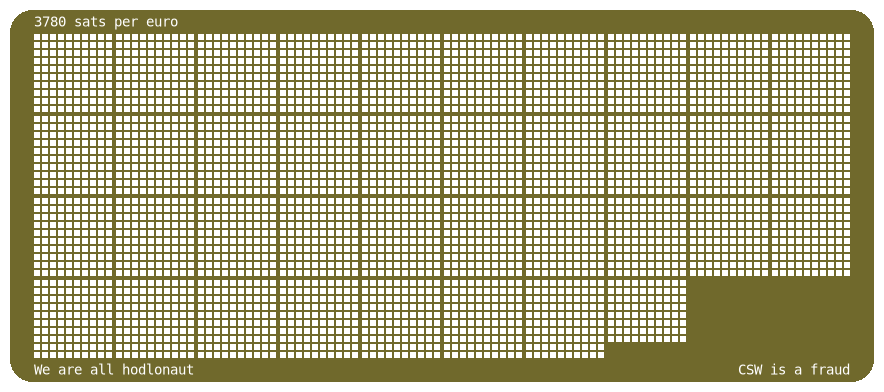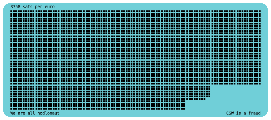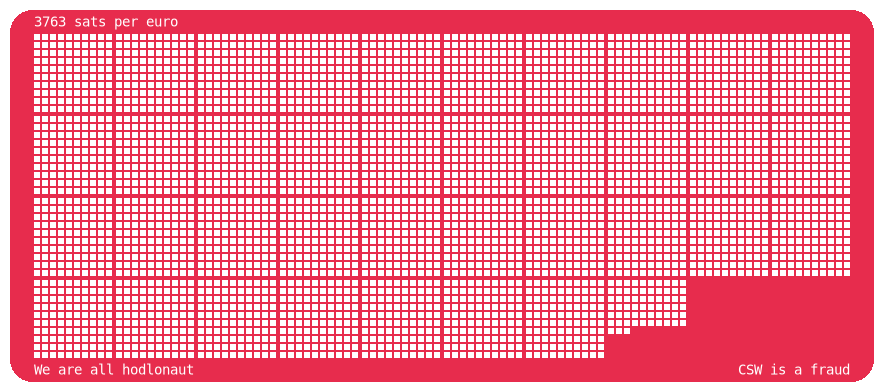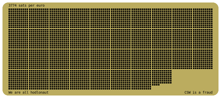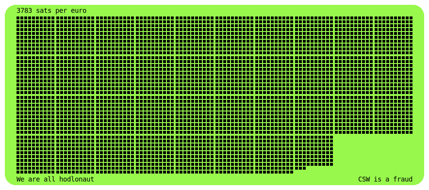Posts sats per Euro every four hours. Price data from Bitfinex. Automation by nostr:npub1hklphk7fkfdgmzwclkhshcdqmnvr0wkfdy04j7yjjqa9lhvxuflsa23u2k.