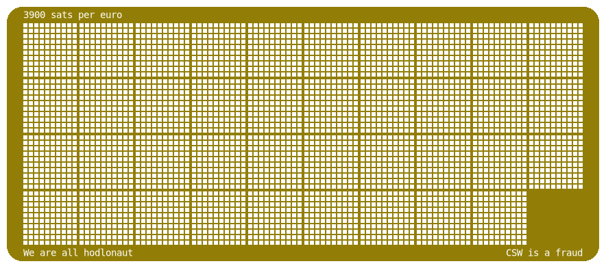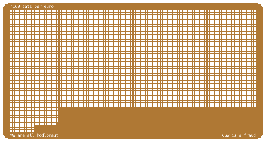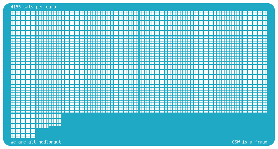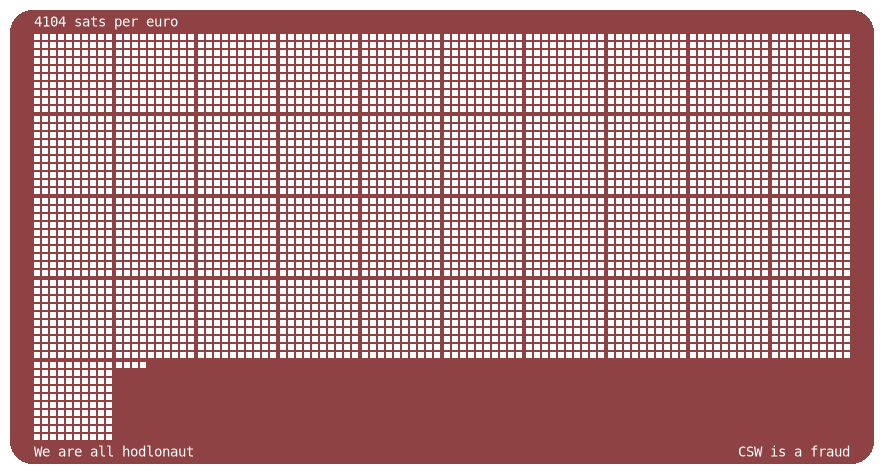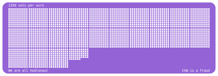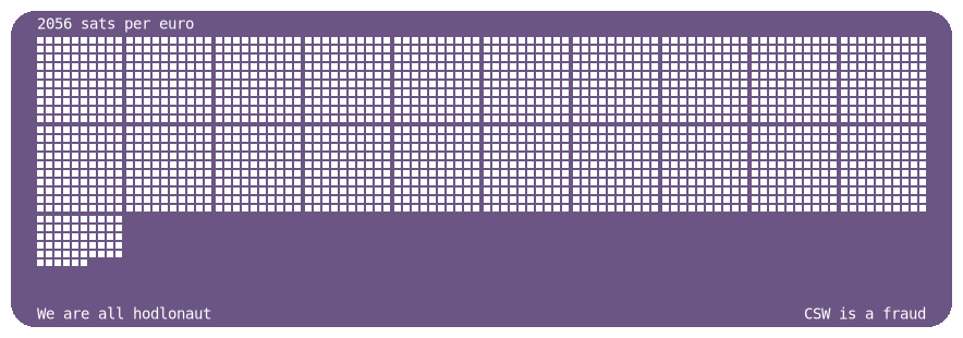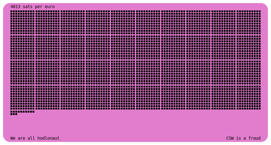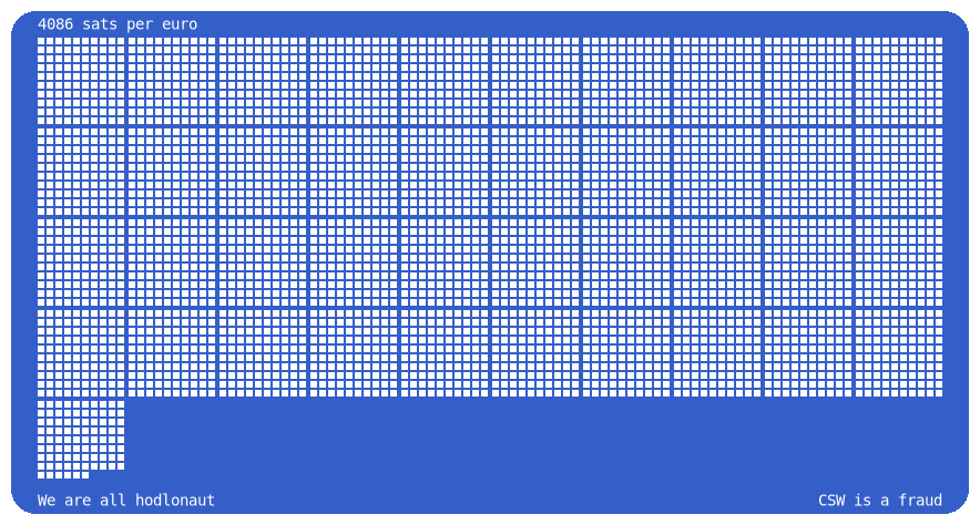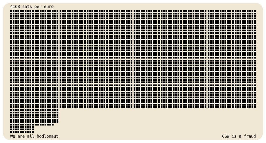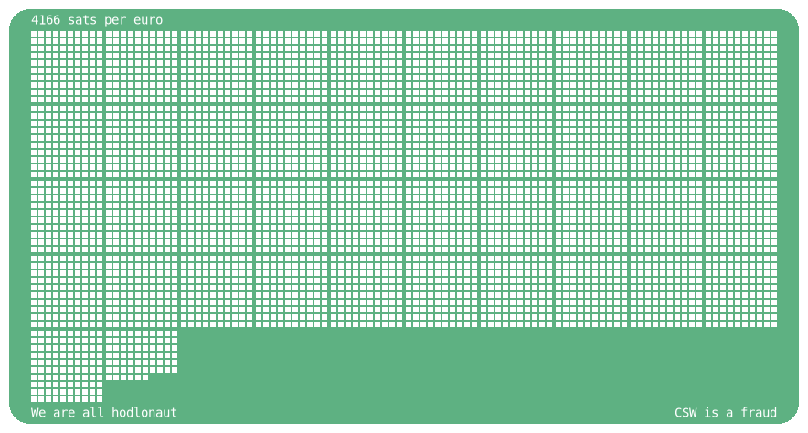 Posts sats per Euro every four hours. Price data from Bitfinex. Automation by nostr:npub1hklphk7fkfdgmzwclkhshcdqmnvr0wkfdy04j7yjjqa9lhvxuflsa23u2k.