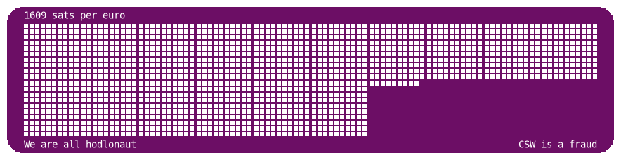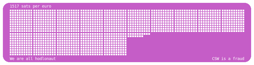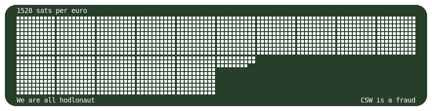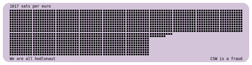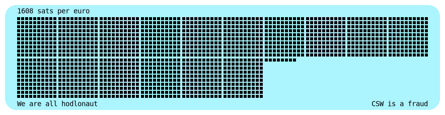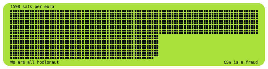 Posts sats per Euro every four hours. Price data from Bitfinex. Automation by nostr:npub1hklphk7fkfdgmzwclkhshcdqmnvr0wkfdy04j7yjjqa9lhvxuflsa23u2k.