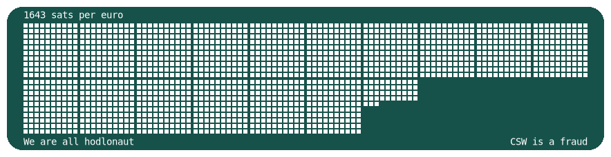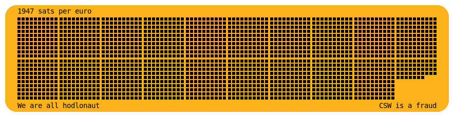 Posts sats per Euro every four hours. Price data from Bitfinex. Automation by nostr:npub1hklphk7fkfdgmzwclkhshcdqmnvr0wkfdy04j7yjjqa9lhvxuflsa23u2k.
